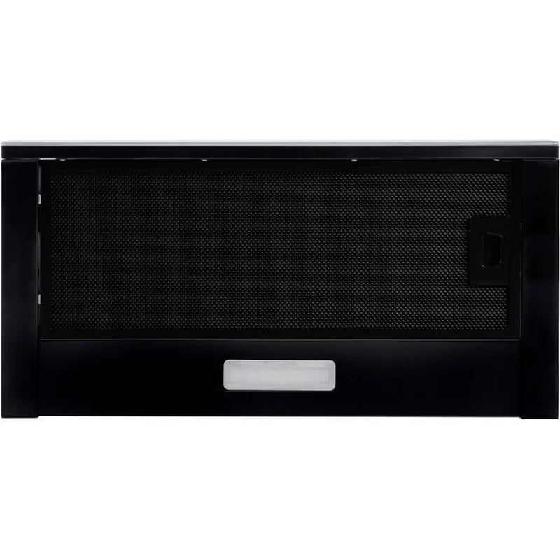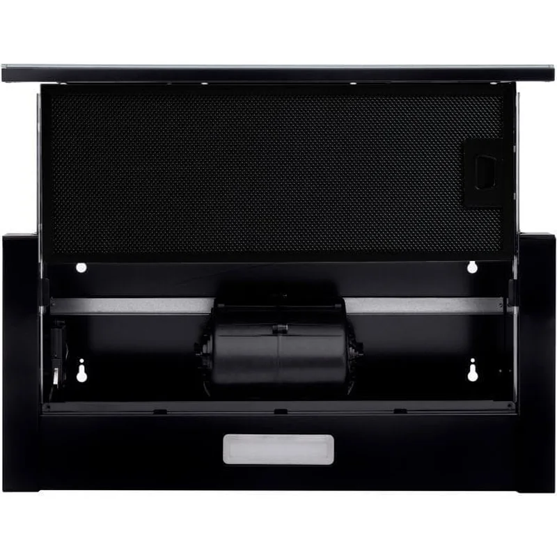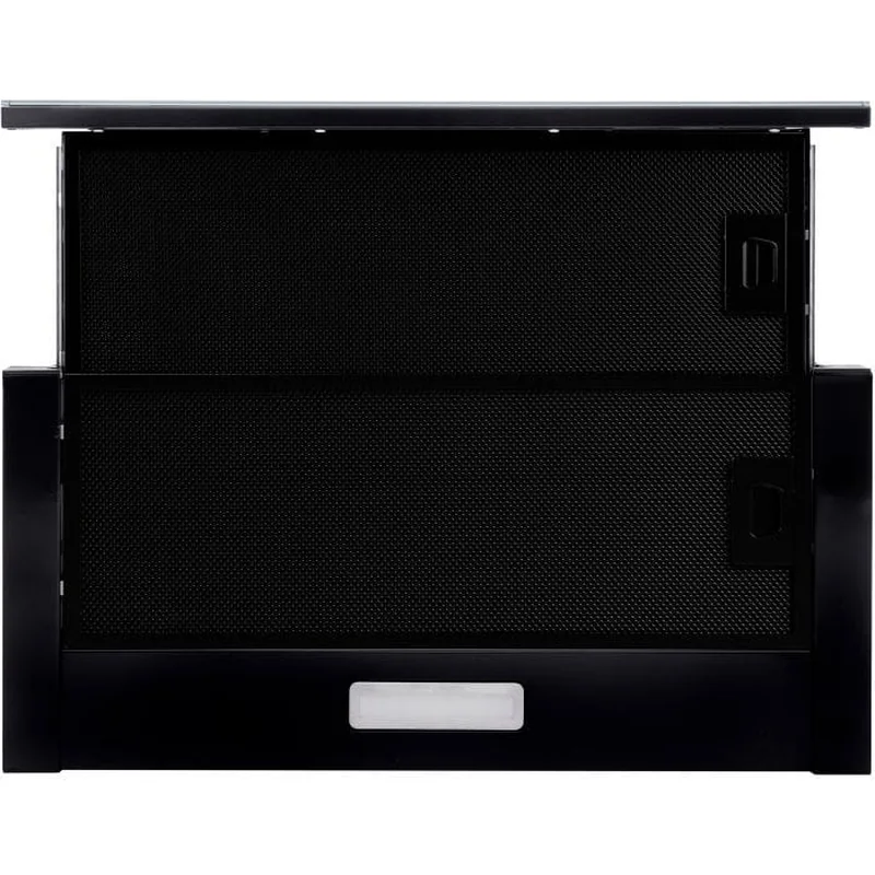 Декоративная выдвижная панель вытяжки изготовлена из закаленного стекла черного цвета, которое отличается высокой жароустойчивостью, стойкостью к механическим повреждениям и своим эстетическим видом, что придется по душе любому кулинару.