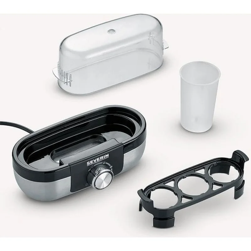 одновременно. Электронный контроль времени приготовления позволяет просто и индивидуально настроить желаемую степень жесткости яиц – измерение количества воды с миллиметровой точностью осталось в прошлом! Снимаемая прозрачная крышка облегчает очистку, а использование материалов, на 100% не содержащих бисфенола А, гарантирует безопасность продукта. Мерный стаканчик для воды с прокалывателем для яиц входит в комплект!